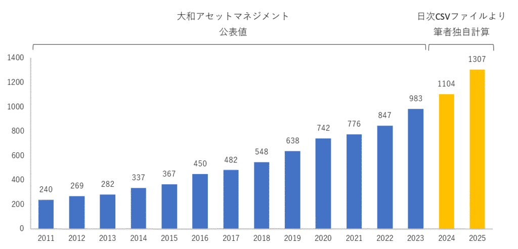 まず、2011年から2023年までは大和アセットマネジメントが公表している信頼性の高い数値を使用します。