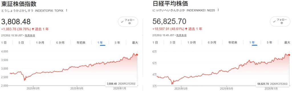 実際にTOPIXが過去1年間で39.8%上昇しているのに対し、日経平均株価は48.6%と驚異の上昇を見せています。