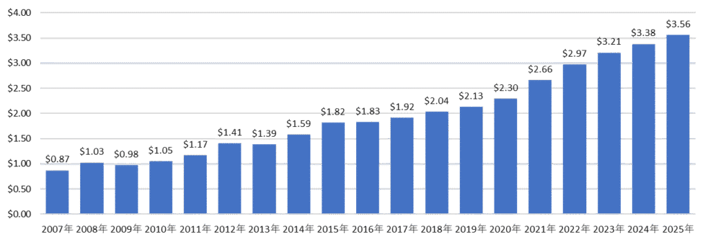 VIGの分配金は2007年に1口あたり0.87USD、2025年には3.56USDとなっています。その間の平均増配率が「年率8.1%」という素晴らしい実績を叩き出しています。