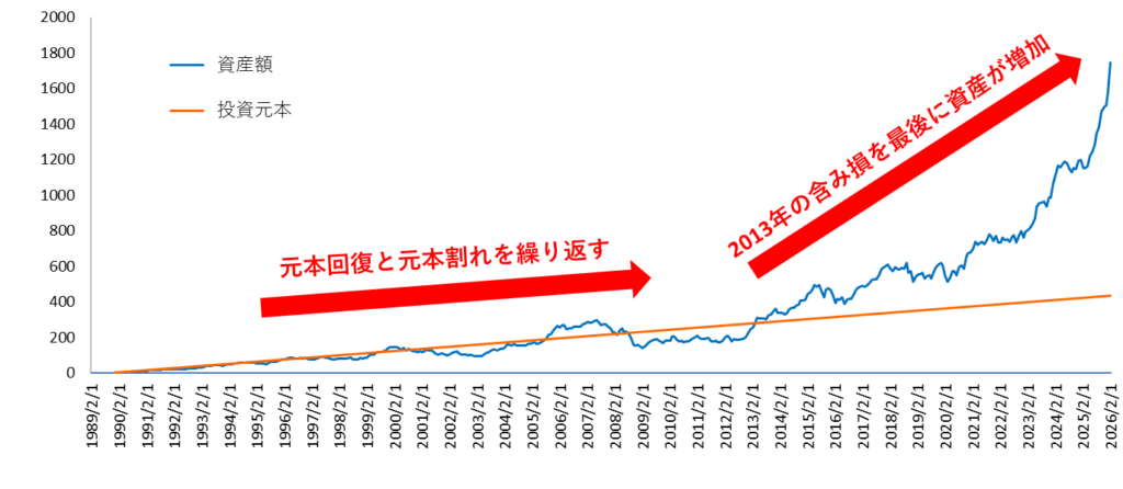 計算の結果、1994年5月には元本を回復し、その後の9月には一時的に含み損へ。その後も含み損と含み益の期間を行き来しながら、2013年4月に再び元本を回復しました。そして2013年4月以降は、一度も含み損に戻っていません。